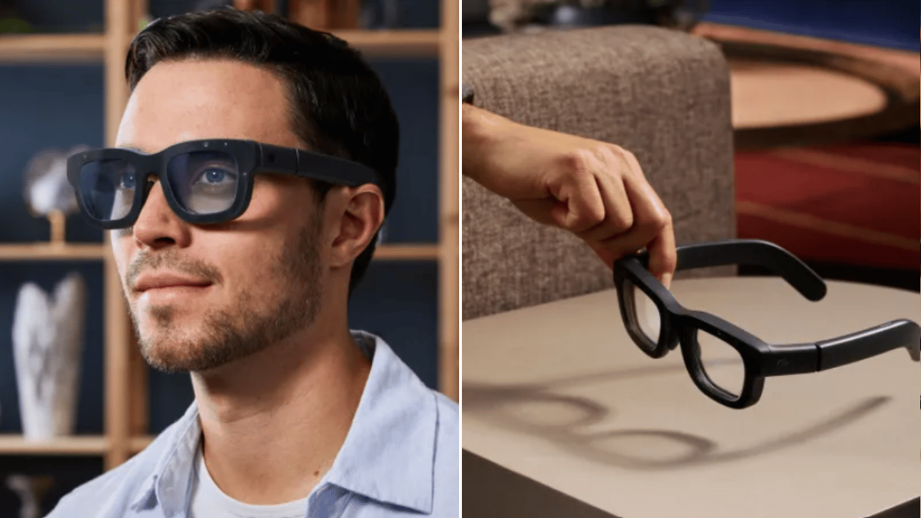 The glasses incorporate multiple input methods, including voice, eye tracking, hand tracking, and a wristband with electromyography (EMG) technology.